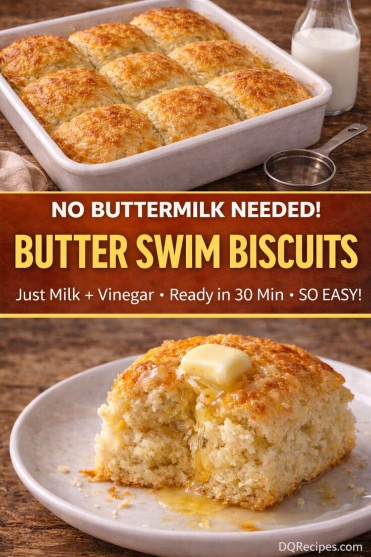 Incredibly easy butter swim biscuits made WITHOUT buttermilk! Just milk + vinegar. Crispy, buttery edges with fluffy insides. No rolling, no cutting. Ready in 30 minutes!